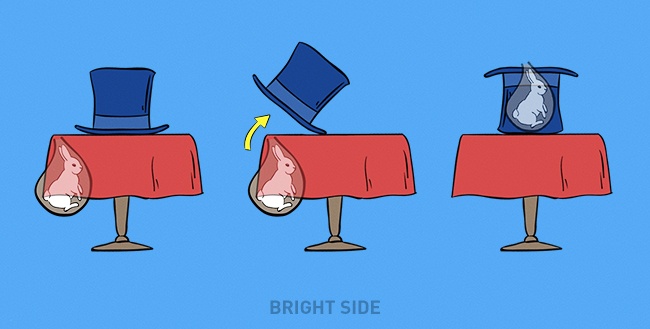 To perform this trick, you’ll need a rabbit, a tablecloth-covered table, a piece of cloth, and a top hat. Take a square piece of thick black cloth and tie all of it’s four corners together loosely. Place a rabbit inside this improvised sack. Hang the sack on a hook, located at the side of the table that will be facing you during the performance. The tablecloth needs to be arranged in such a way as to prevent the audience from seeing the sack. At the beginning of the performance, show the top hat to your audience to demonstrate that there’s nothing inside. Next, put the hat on the table, with the hat opening facing the table surface. Now comes the most important part of the trick. Using easy and inconspicuous movements, lift the hat quickly by the brim and put the sack underneath the hat. Now, make some movements showing that you’re conjuring something up, remove the hat from the table and reveal the rabbit to the audience!