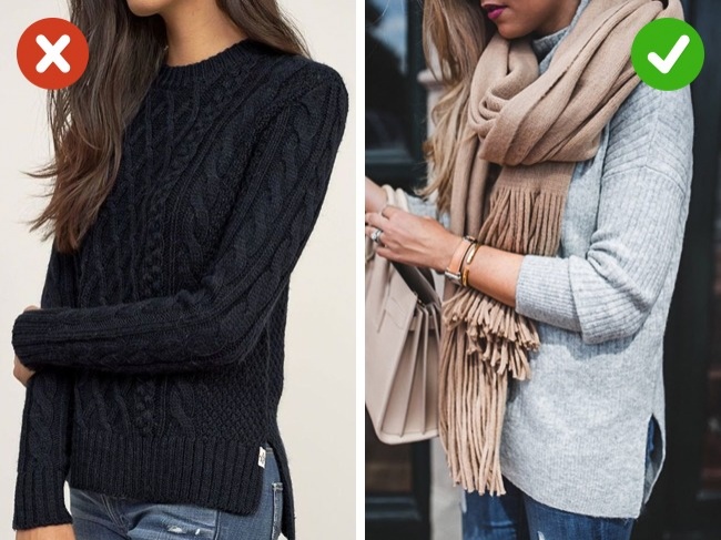 Synthetic fabrics may be cheap, but they look cheap as well. They crumple, lose their shape, and get dirty all too quickly. We advise you to stick to high-quality knitwear made of cotton, chiffon, silk, wool, and denim. Things made from those fabrics are more expensive, but not by much. They also look incomparably more appealing and give you a sense of true comfort.