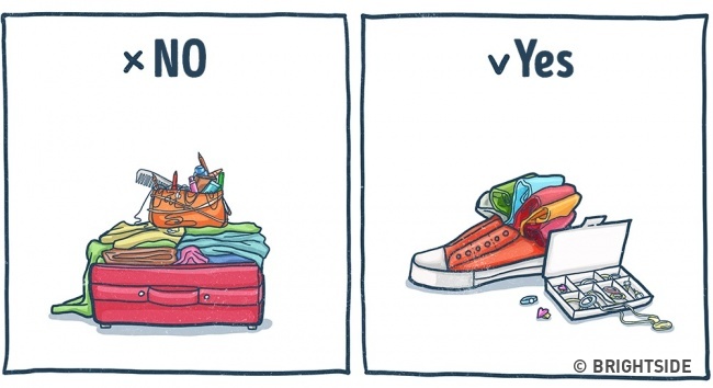 When it comes to packing small objects such as USB memory sticks, pocketbooks, hairpins, tights, socks, sunglasses, and reading glasses, place them inside packed shoes, cosmetics boxes, document folders, and suitcase pockets. As for your jewelry items, you can store them inside a pillbox.