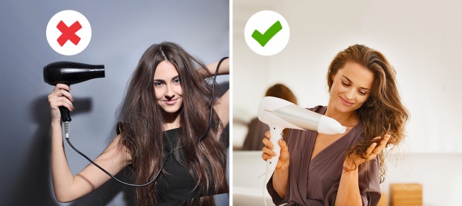 At the beginning, while the hair is still wet, it is OK to switch the dryer to maximum temperature. But then, little by little, the temperature needs to be decreased to avoid overdrying. A word of advice — when buying a hairdryer, give preference to models with multiple temperature settings!
