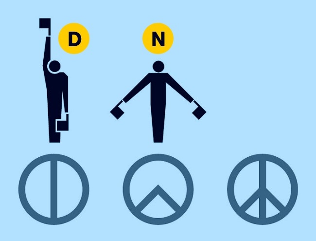 In the semaphore alphabet, the letter ”N“ is transmitted by holding two flags in an inverted ”V,” and the letter “D” is formed by holding one flag pointed straight up and the other pointed straight down. Superimposing these two signs forms the shape of the peace symbol.