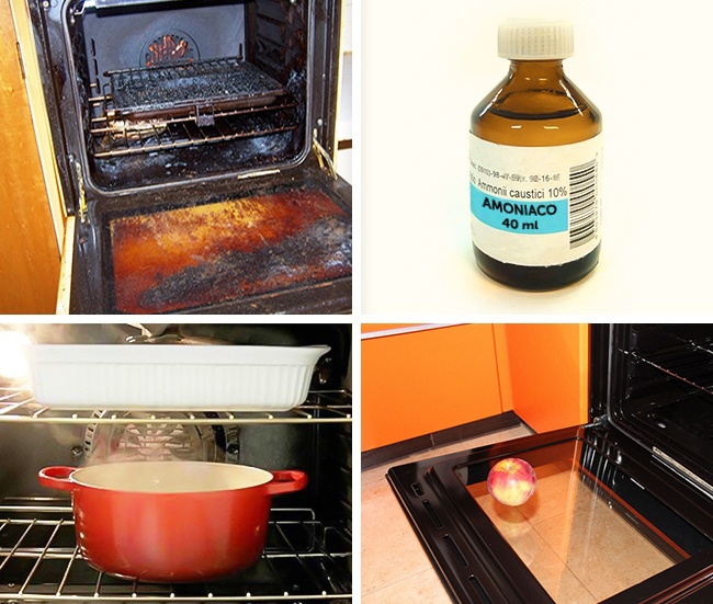 It’s easy to remove the oil and soot from the oven with a glass of ammonium chloride and a liter of water. Pre-heat the oven to 150°C (302℉) and then turn it off. Place a pot of hot water on the lower level of the oven and a pot of ammonium chloride on the top. Close the oven and leave it to cool overnight. The next morning, add a few teaspoons of any detergent and 1/2 cup of warm water to the pot of ammonium chloride. Wipe the oven with this solution using a sponge, and then wash it off with water.