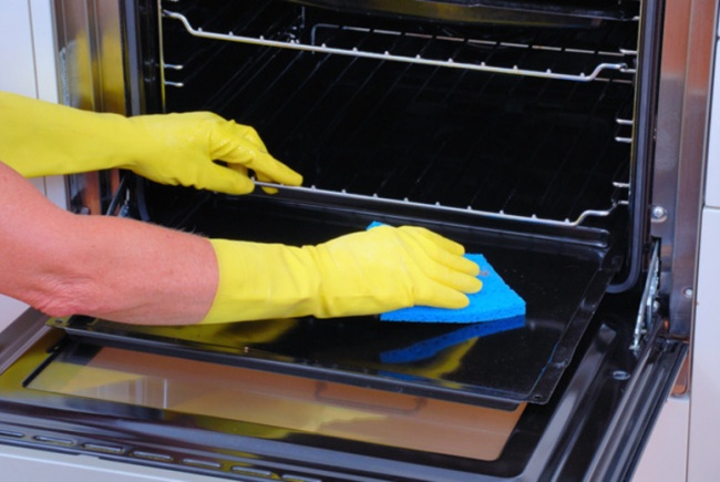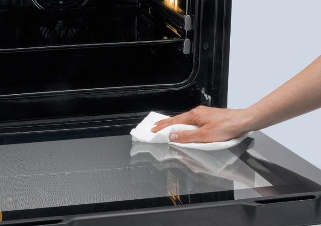 Baking powder is a great natural cleaner for oil and soot. Wipe the oven with hot water, sprinkle with baking powder, and spray water from a spray bottle. After half an hour, remove the clots of powder with a damp cloth and wash the oven with water. This method will help above all to remove any oily stains from the glass door very easily.
